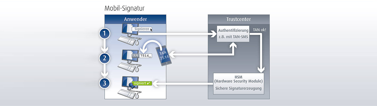 - Daraufhin erhält das Trustcenter eine Signaturanfrage und startet die Authentifizierung, z.B. mit TAN-SMS;