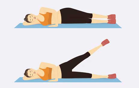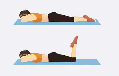 - Den Oberschenkel des gebeugten Beines von der Unterlage abheben und die Ferse nach oben strecken.